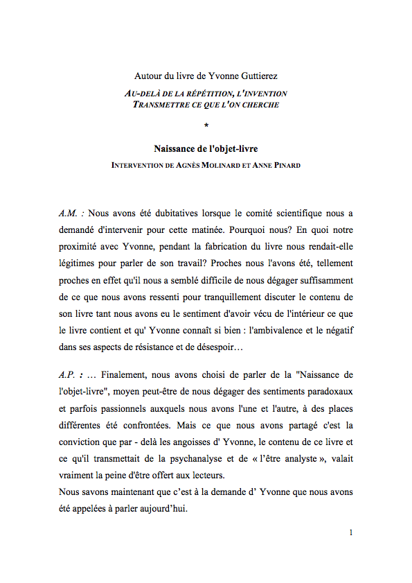 - Présentation du livre d’Yvonne Gutierrez : Au-delà de la répétition, l’invention, L’Harmattan (14 janvier 2017), Catherine Desvignes, René Kaës et Jean-José Baranes, interventions d’Anne Pinard-Gautreau et Agnès Molinard.